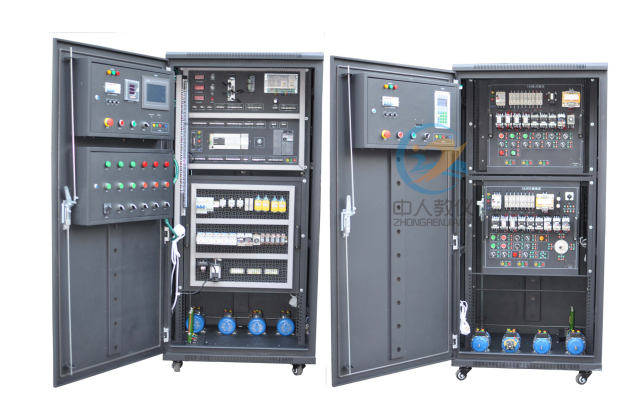 1.本裝置采用標準配電柜為主體柜,充分利用該柜雙面空間位置,其中裝有可方便拆卸的電源控制、交直流電源、測量儀表、低壓電氣器件,另一面裝有PLC模擬量模塊、變頻器、直流調速模塊、機床智能考核,該配電柜占地面積小,外形美觀;2.電氣控制線路元器件都裝在電氣柜內部,配有布線槽、接線端子;通過端子學生可自行接線、布線,構建控制系統,實訓特點明顯,同時具有一定的擴展性;